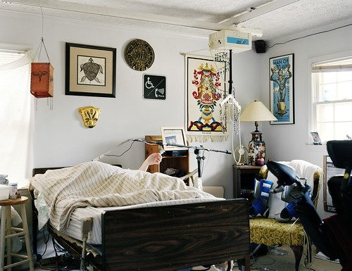 Like several artists in the show, Stolfa’s works come from a road trip around the country during which she took photos of friends as well as of complete strangers. One remarkable photo of a light-filled bedroom in Athens, Ala., is a puzzle that slowly unfolds. As details add up, you realize the art-bedecked room also contains a hospital bed and medical apparatus and belongs to someone bed-ridden. The person is tucked under a blanket and all but hidden, and this “I am my room” portrait could be set in an institution and not what looks to be an ordinary bedroom in a house.