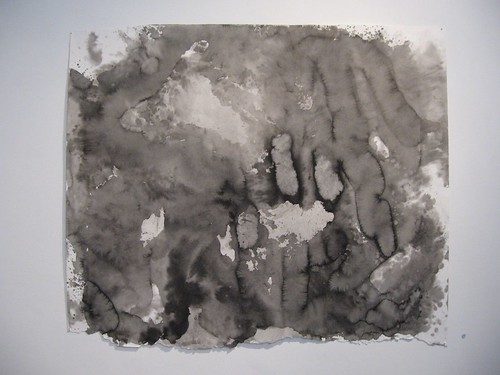Bratton is the more conservative of the two, his work falling within what people expect to see in art galleries–something rectangular and arty. Some of the pieces are quite beautiful, ink drawings dipped in water, and poetic, often landscape-related forms.