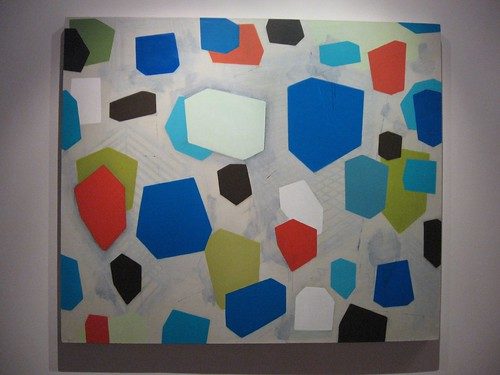 On the other hand, I deeply loved Baris’ Whole New Distance paintings–small round bubbles of plaid-painted plexiglas. These are comic, with shiny, raised blobs of pop-colored paint sometime falling off the edge, sometimes creating the only focus. The blob shapes raise these pieces above the plaid decorativeness, and make me think of older work by Thomas Nozkowski, whose abstract forms recall the iconography of the comics and whose colors recall bygone eras of home decoration. Baris pares the abstracted shapes down to icons.