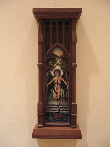 All the work mixes imagery from paintings of Catholic saints with a vague fantasy cosmology, using retro-looking stained glass, woodblock prints, and oil paintings on panel. The craftsmanship is noteworthy. Some of the work–all of it quite small–is lovingly framed in elaborate wood cases reminiscent of church architectural detail.