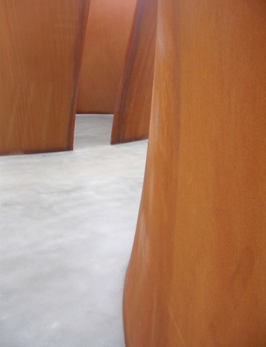 We approach the masterwork “Open Ended” from the side and are met with a concave face that rolls up and away from us like the backside of a wave or the flank of a whale. Six massive sheets of steel wall lean and counterbalance against each other creating three toruses meeting three spheres. These, in turn, are positioned to create six corridors leading to a central core. We can enter this structure from two different ends that propose two different spatial experiences. Depending on the entry you will be walking between either two toruses or two spheres until you reach the core whose two walls consist of one torus and one sphere. You then continue and exit through a corridor with a totally different geometrical configuration (if you arrived by torus you will leave by sphere).