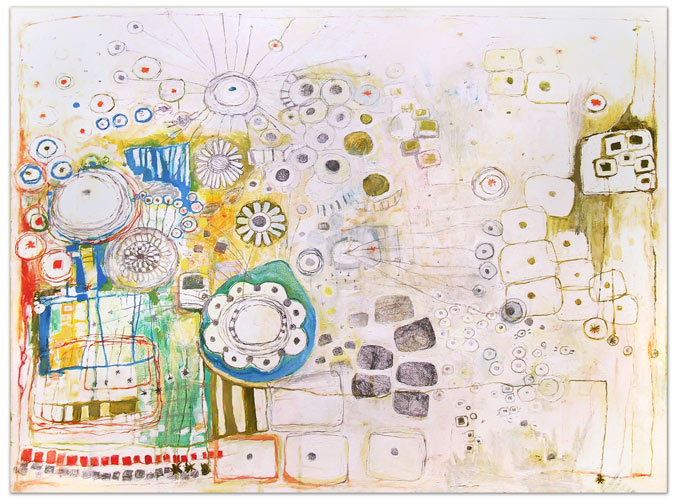 The artist’s vocabulary of shapes comes right out of universal doodles: Circles in squares or circles in circles; circles encircled with starbursts of lines like round millipedes; or circles with long legs like jellyfish. These little characters are placed in overall compositions that speak of eternal flux that is peaceful but may also include upheavals.