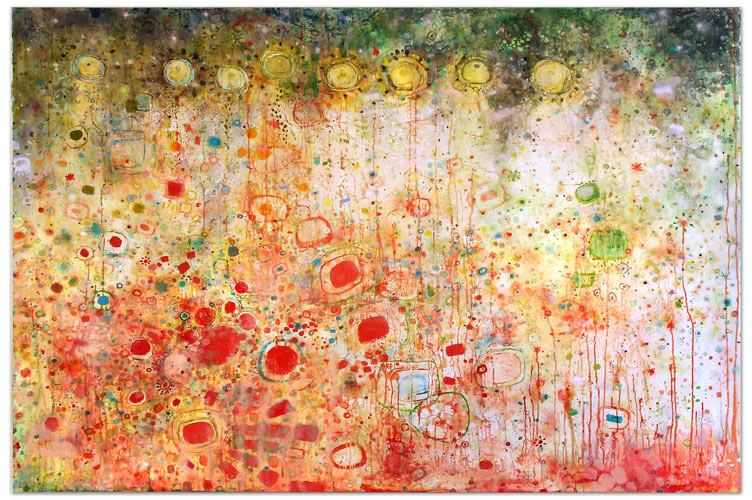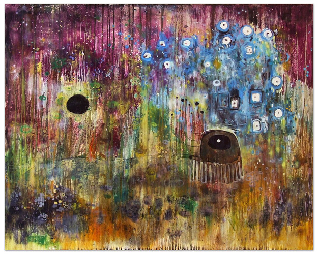 Fialho, (b. 1984) now in her Philly debut at Mayer, is a young Brazilian-born New York artist who really knows how to pour on the colors, the textures, the drips and the ur-shapes that might or might not signify. Her large, dreamy oil paintings have a watery or melting quality as if they washed in on a wave and may just disappear again dissolving into the elements. They are aboriginal, almost shamanistic, like they were made to convene the stars for a blessing or ceremony.