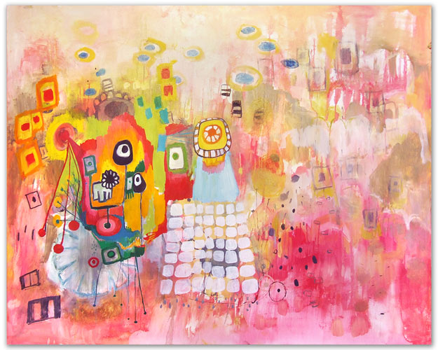 Most contemporary art that’s pretty is “pretty” — it uses tropes of prettiness (pastel colors, lucious paint or surfaces) as a foil for some edgy subject matter that is not pretty. (Lisa Yuskavage, with her cotton candy colors and grotesquely-shapen women, is a practitioner of this kind of “pretty.”) But Fialho’s sense of prettiness and beauty comes from the desire to express the Jungian soup we all swim in where in our dreams we are one with the earth, the planets, humankind, the animals, insects and the stars. (Well maybe not the insects but you know–everything else.)
