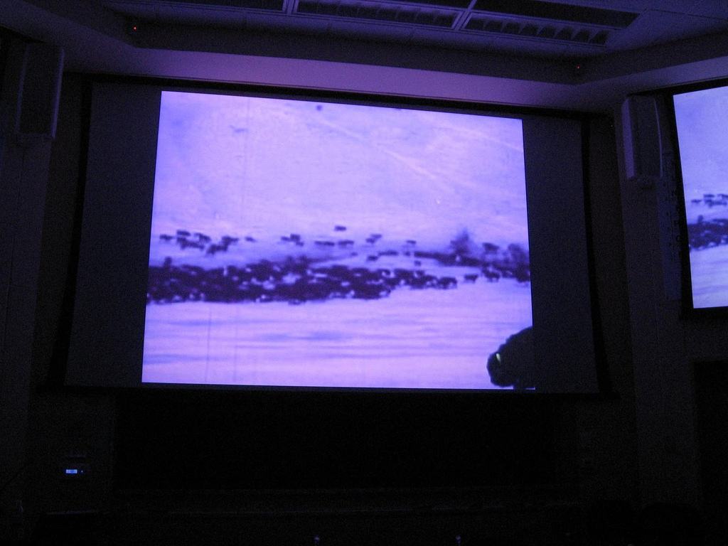 In a clip from her video Untitled #1 (from the series Earth People 2507), Fufu dons buffalo horns and becomes a whole herd, inserted into a photo of a genuine buffalo herd. (I don’t know one dog from another, but Fufu is small and dark grey, with lots of curls–think Peek-a-Poo or miniature poodle scale). Ultimately the dog turns pirouettes and so do ballerinas while the prairie turns into an aurora borealis. I don’t know why I loved this, but I was completely enchanted.