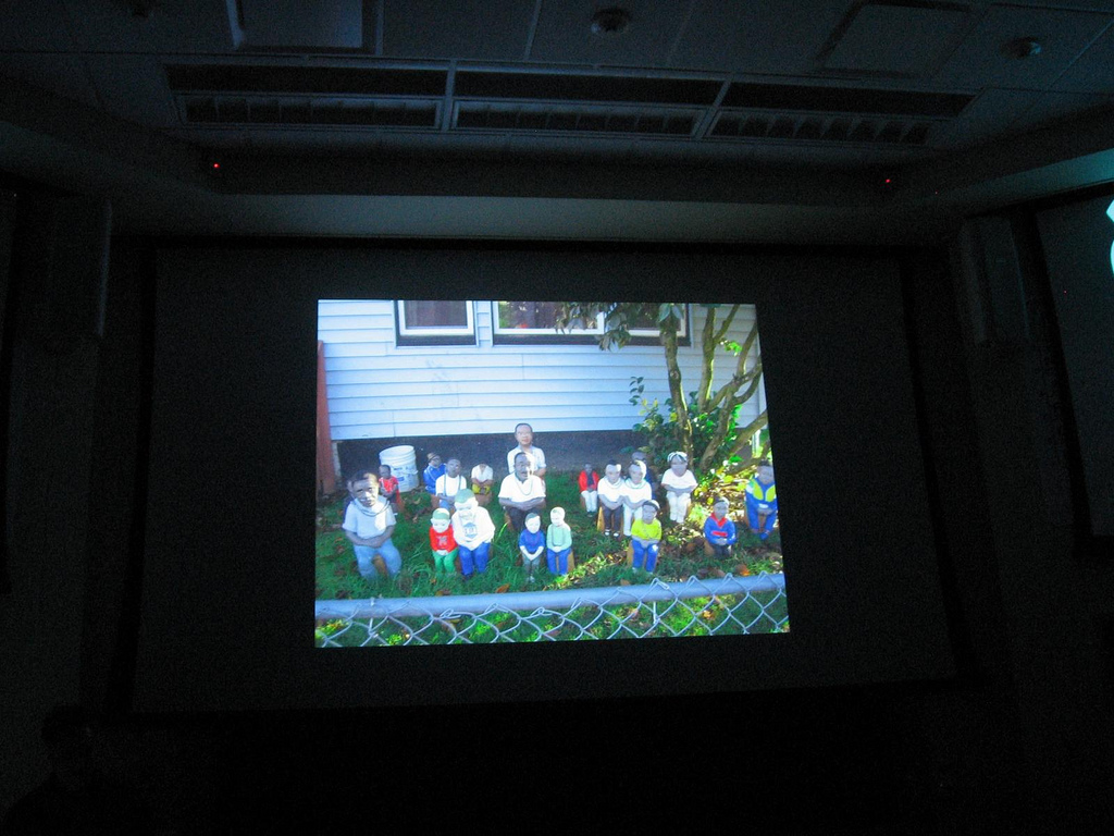 Harrell Fletcher‘s work is community-driven and collaborative. Fletcher described a number of his projects, like making multiples of a couple’s lawn ornament figures after one of them was vandalized. He displayed them in a gallery and also placed them like a family reunion on the couple’s lawn. Some of his work reminds me of Pepon Osorio’s, especially in his understanding of the emotional weight of objects that people hold dear and in his commitment to communities.