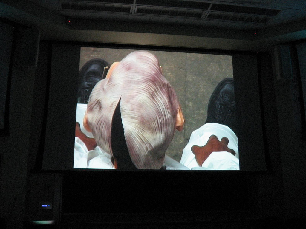 I was especially excited about seeing William Pope.L in person (he’s an imposing figure, tall and good-looking and reserved). He showed a recent video of himself covered head-to-toe in a white hazardous-clean-up jump suit and wearing an aging white-guy full-head rubber mask, making people people uncomfortable with his outlandish outfit and his anti-social acts on the streets of a former Eastern Bloc city.