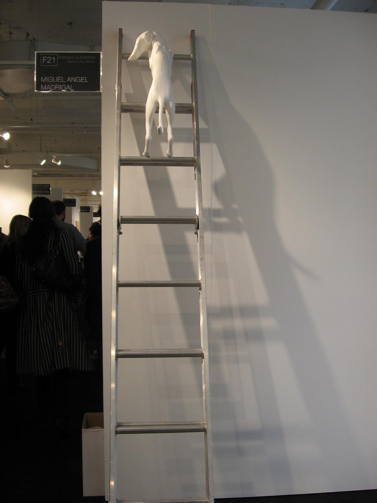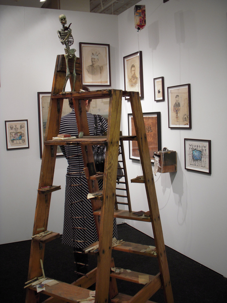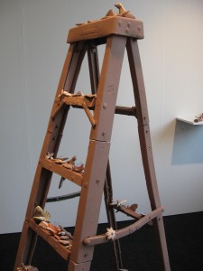 Another sculptor that caught our eye is Margarita Cabrera at Walter Maciel Gallery. Her clay-coverd works which cued on Mexican folk art had great surfaces that you wanted to touch. We stuck our hands in our pockets. The gallerist said the clay was covered with a glaze named “Mexican doll face.” Cabrera, whom we have seen previously at art fairs — and loved — when she was working in fabric, was born in Mexico and works in Los Angeles. The gallerist told us she was embarking on a new project with Mexican wood. She likes her materials. One of Cabrera’s pieces was a ladder, festooned with little decorations. Turns out there were three art ladders at Volta…and another ladder at Fountain (although that one was not art). Here’s our three other ladders for you.