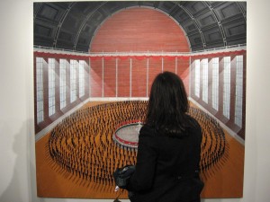 Painting-wise, Ian Davis‘ hyper-surrealist acrylic and spray paint on canvas works showing mini-people in maxi-arrays remind us of Michal Rovner‘s mini-peopled videos (we saw her works in the Armory just a couple days earlier).
