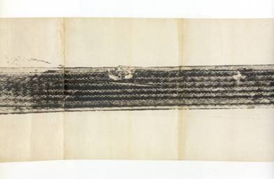 Another favorite is Rauschenberg’s “Automobile Tire Print” (1953) where Cage was “printer” and “press,” driving his Model A over 100 sheets of typewriter paper that Rauschenberg had laid out one rainy day on Fulton Street in NYC. The tire, inked with black house paint, produced a kind of musical score; the finished work resembles a scroll. [See Rauschenberg talk about the event.]