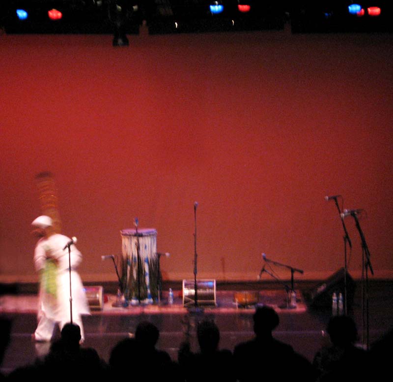 The literature on Sufism will inform you only generally about the obscure Sidis; theirs is community of just 15,000 that detached from its East African origins eight hundred years ago. Like the whirling dervishes (also Sufis), their ritual performance is not just for the audience’s sake: its acrobatics and aerobics are intended to elevate the dancers towards the divine. The program at Painted Bride included a panel discussion in the lobby an hour prior to curtains, with a UPenn ethnomusicologist, the Bride music curator, and – most vocal – the tour manager Katrina Pavlakis, who’s apparently working pro-bono. She also had the most relevant knowledge: we wouldn’t see fire-dancing that night, she told us, as some elements of the ritual don’t leave their village. And is the Sidi community self-sufficient (read: isolated)? She answered, impatient at the idealizing inherent in the question: “well, yeah, if that’s what you call subsistence. Because of discrimination, access to education, and the size of their community, few are employed in the [formal] economy.”