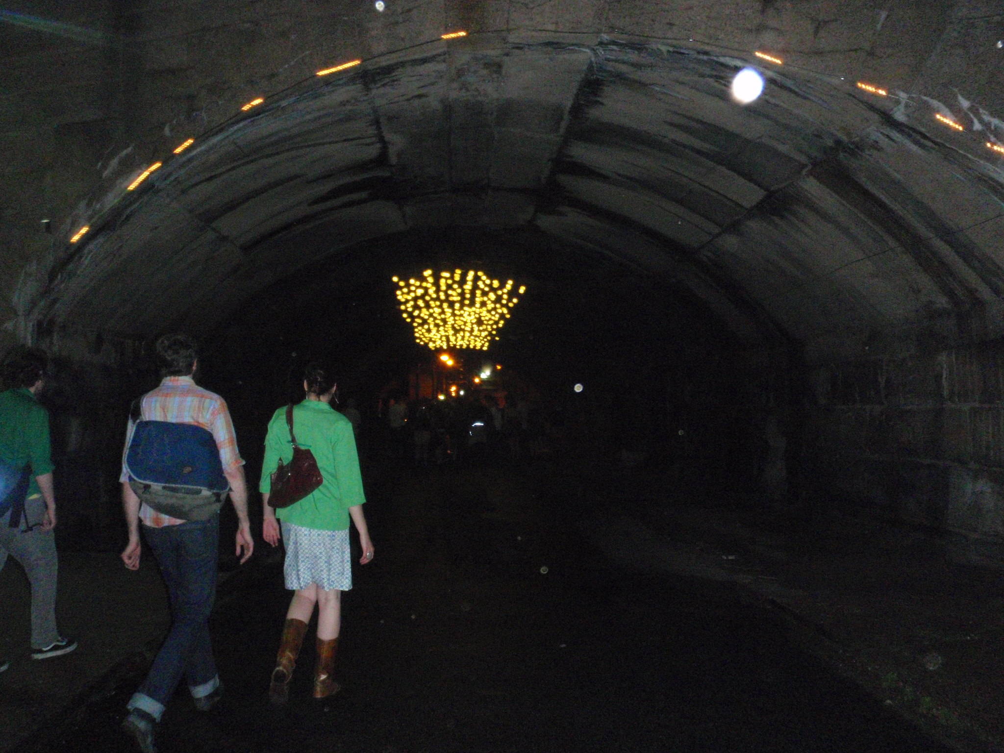 Before I had more time to investigate the specifics of the music theory displayed on the walls in Music and Sound, an event began unfolding downstairs. It was another eerie choreographed experience; descend the stairs, migrate across the street towards the light emanating from yellow bulbs suspended at the tunnel’s ceiling under the tracks.