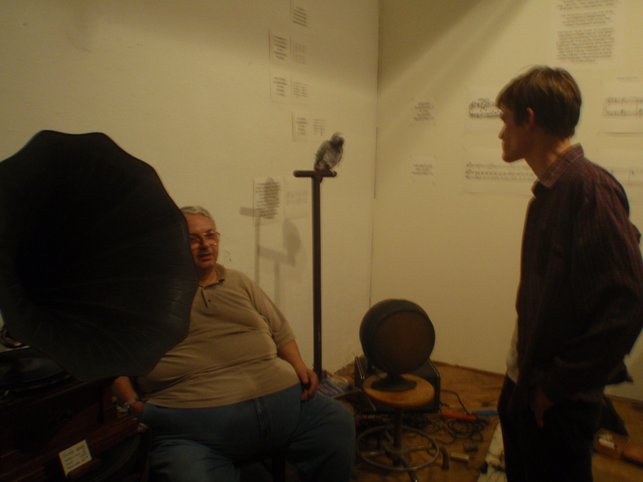 The artist told that the man that he was free to go as the hour was getting late, but the man seemed insistent to stay and accompany his Victrola until the end. Moving around the room one encountered various contraptions and exposed wires, related to the experiment with sound that was the subject of the opening.