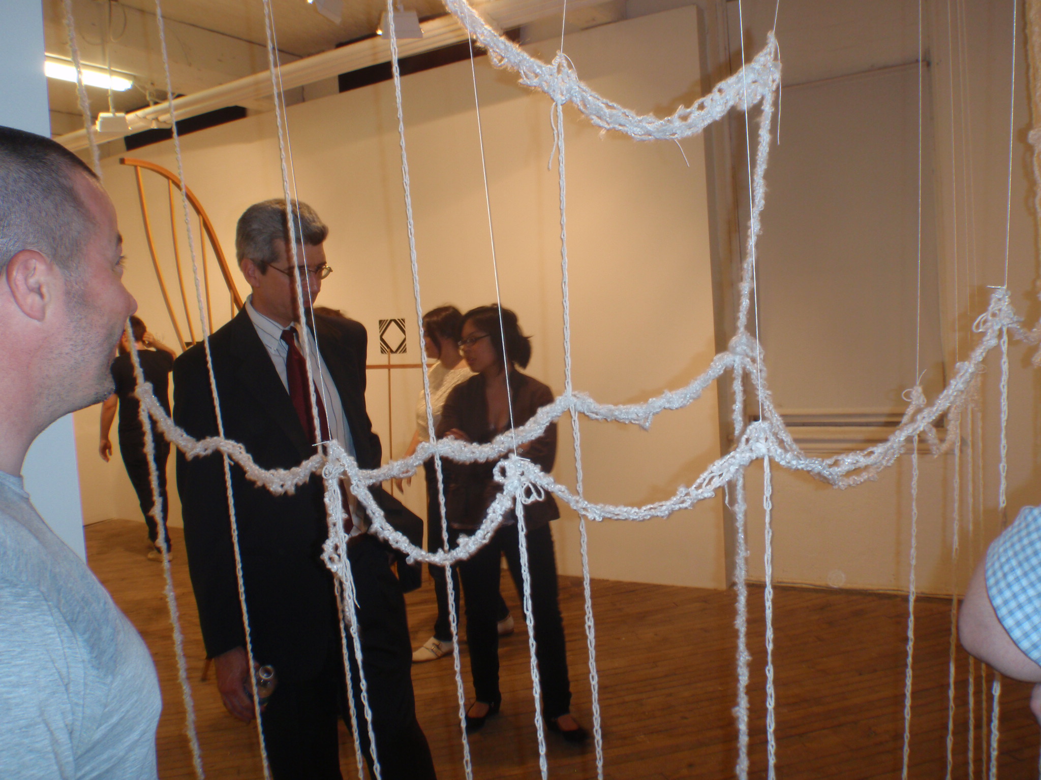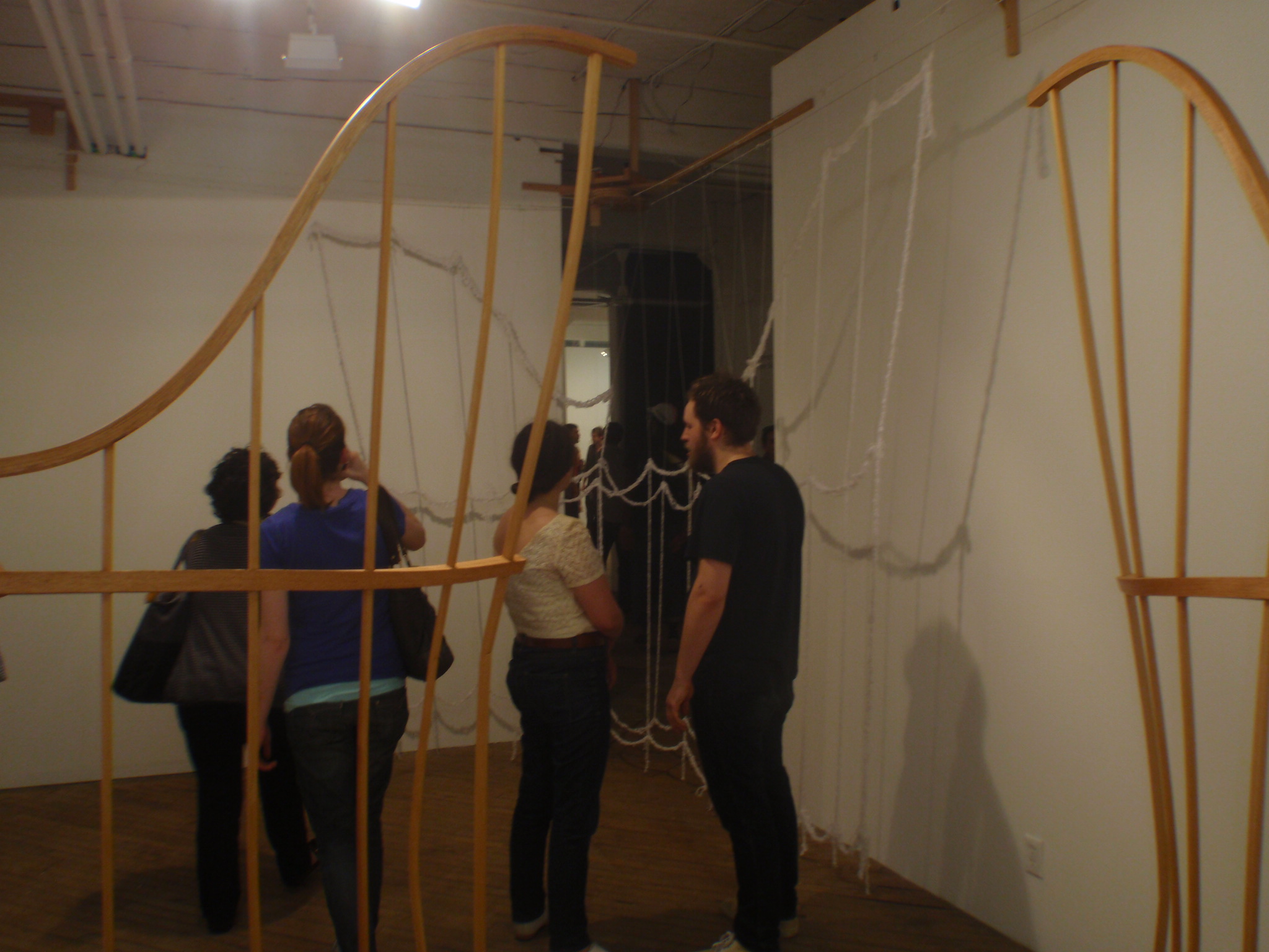 The back-up creates a forced experience between viewers, as people wait to be released or permitted entry by the delicately moving curtain. It also creates a rather timid dance as people flow in and out of the exhibit at regular intervals as the curtains open and close. The result is a displacement of the viewer, as she realizes the restrictions this exhibit places on her viewership. This displacement is nicely complemented by the eerie dream-like quality of both the central gate-object and the mechanical curtain, as well as the background of theramin-generated lulls and the squeaking along of the pulley system.
