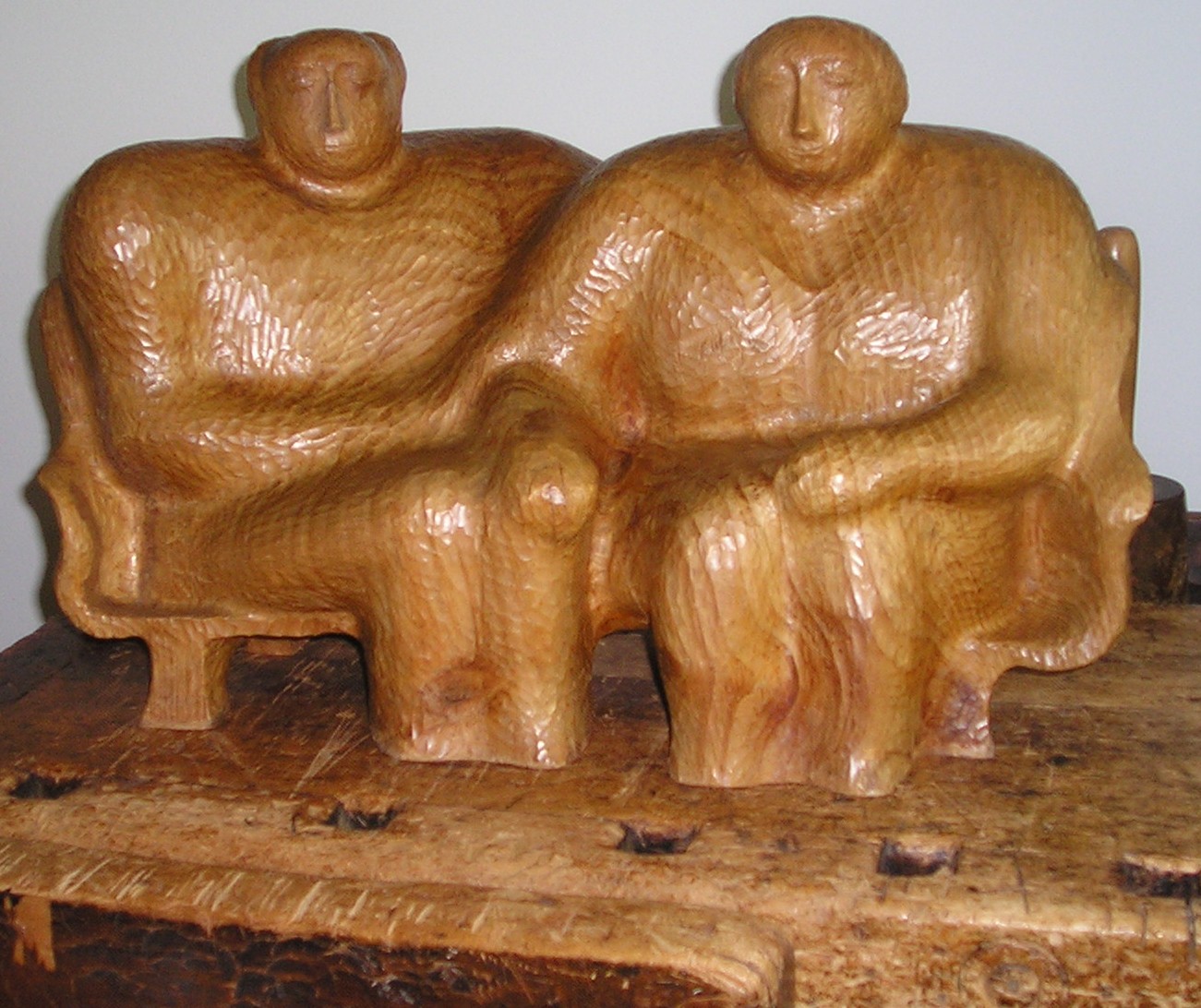 Keyser graduated from art school during a time when wood carving in the United States was thriving. The work of William Zorach and Elie Nadelman secured this popularity. Keyser, however, cites Ossip Zadkine as an “inspiring” influence. She also liked the early work of Henry Moore for a while. Her own work is representational, but simplified. It’s abstracted in the way that Etruscan or Egyptian sculpture is — broadly descriptive but with great economy, like poetry. Late in life Keyser started carving cats, and the wood she chose to do so suggests their soft fur. She is fond of work that hangs on the wall, free from the traditional relief support, or work that can sit, unaided, on the edge of a shelf. The contemporary sculptors she admires include Arlene Love and Steven Robin. Much of her work reflects family life – mothers and children, couples and family groups. She notes that she particularly liked to carve twosomes, saying that “the reason for that is obvious.”