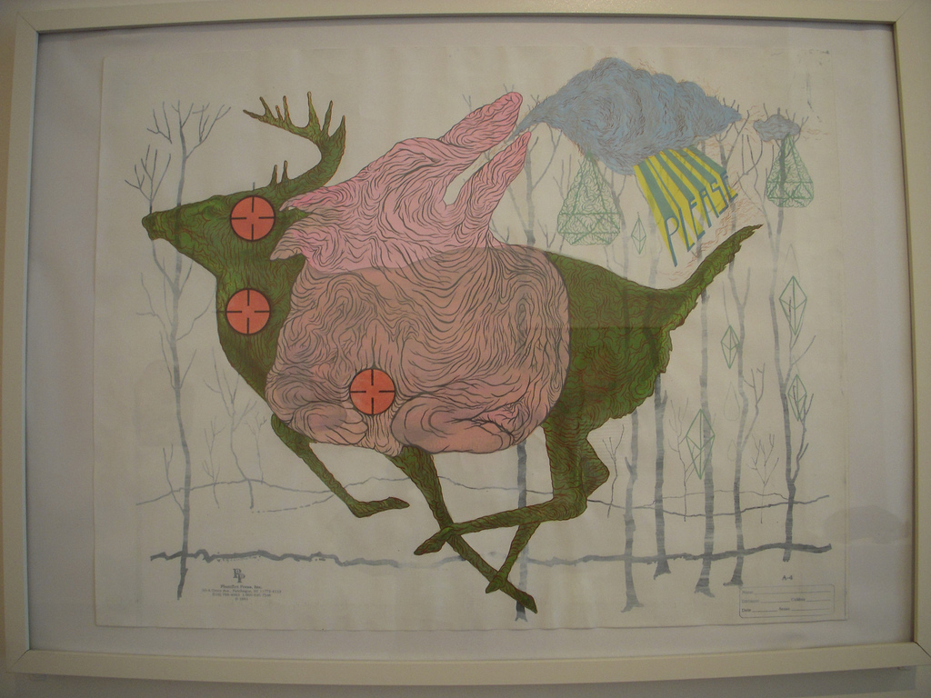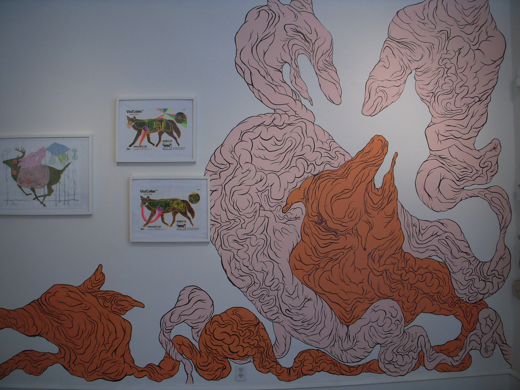 Bonnie Brenda Scott’s paintings on hunters’ target practice sheets are subversions of the hunt. The artist covers the sheets with images of ghost animals, crystals, clouds, and words like “please” and “trouble.” Scott has painted a mural of writhing ghost animals on the wall around these target paintings and the effect is shamanistic—as if the artist is attempting to dispel evil spirits. The mural is a powerful work in a quiet show—weird for its colors (pink and orange) and for its evocation of smoke, viscera and tortured souls.