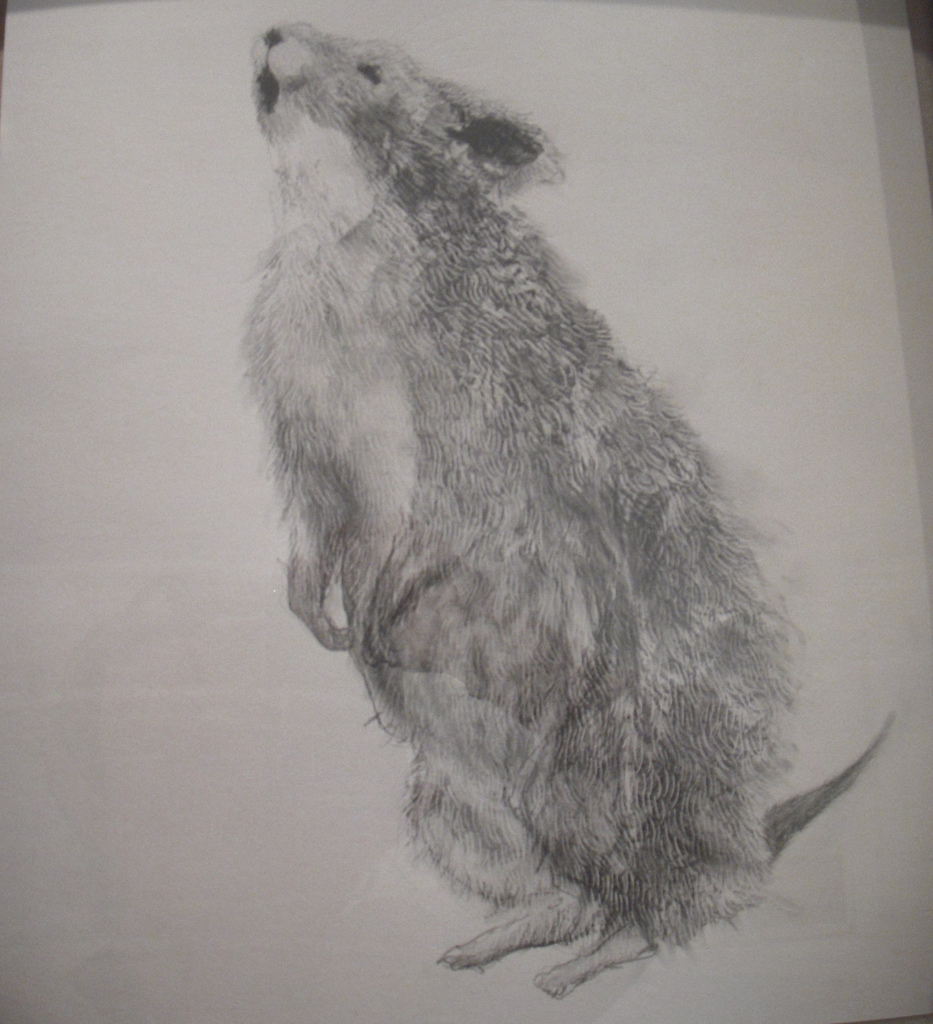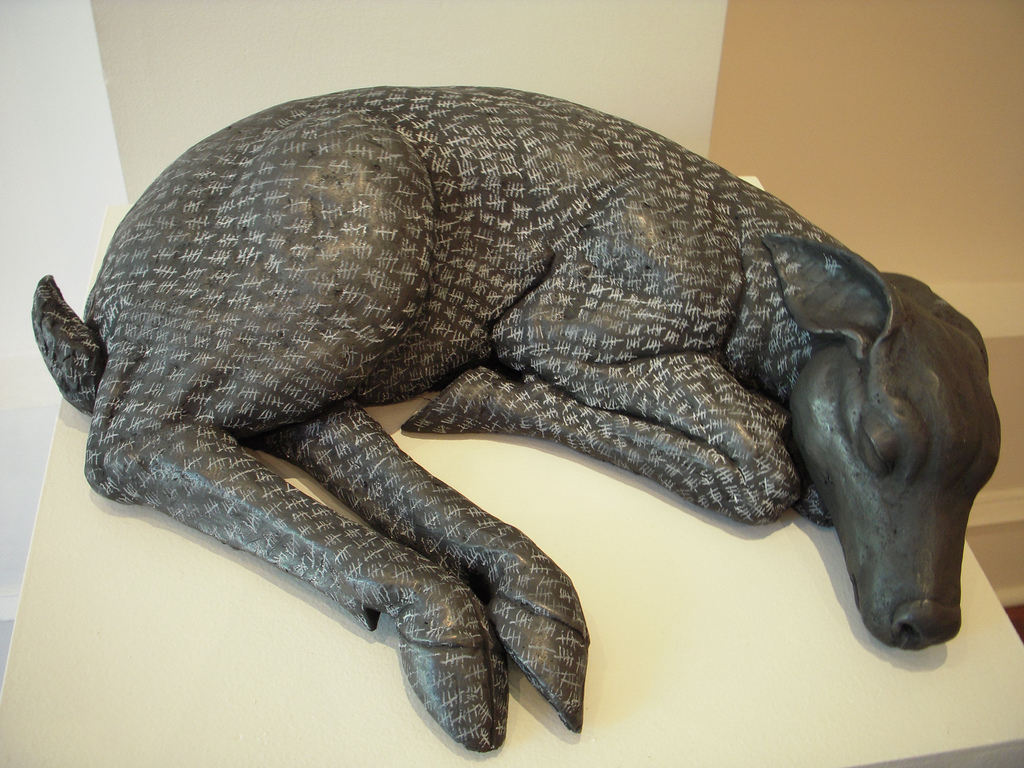 Animals in art are metaphorical stand-ins for things like innocence, strength and freedom. Nowadays wild animals in art mostly refer to species endangerment. Darla Jackson’s sculptural baby deer, small and quietly sleeping on a white pedestal, is mythological, like the unicorn, only far more vulnerable.