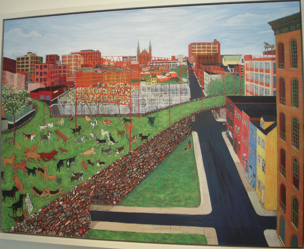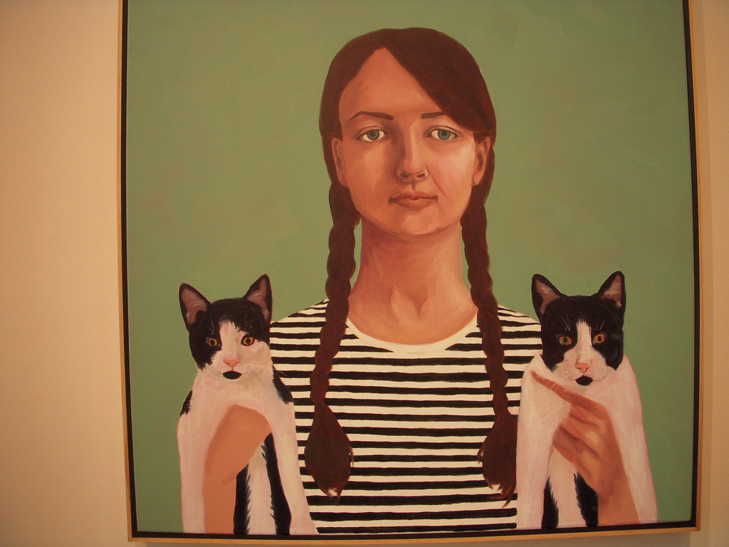 Sometimes, though, a pet portrait is just that—a picture of a dearly beloved companion. Sarah McEneaney’s “Dog Heaven” imagines the best, greenest dog park ever for her beloved dead pets and those of her friends, all lovingly depicted at play in the park. Likewise, Laura McKinley’s “Shilly-Shally” is a straightforward portrait of a serious young woman in a black and white striped shirt holding up two almost identical black and white cats. A deadpan family portrait perhaps, the work is a contemporary update on early American portraits by Ammi Phillips who loved to show children and animals in her work.