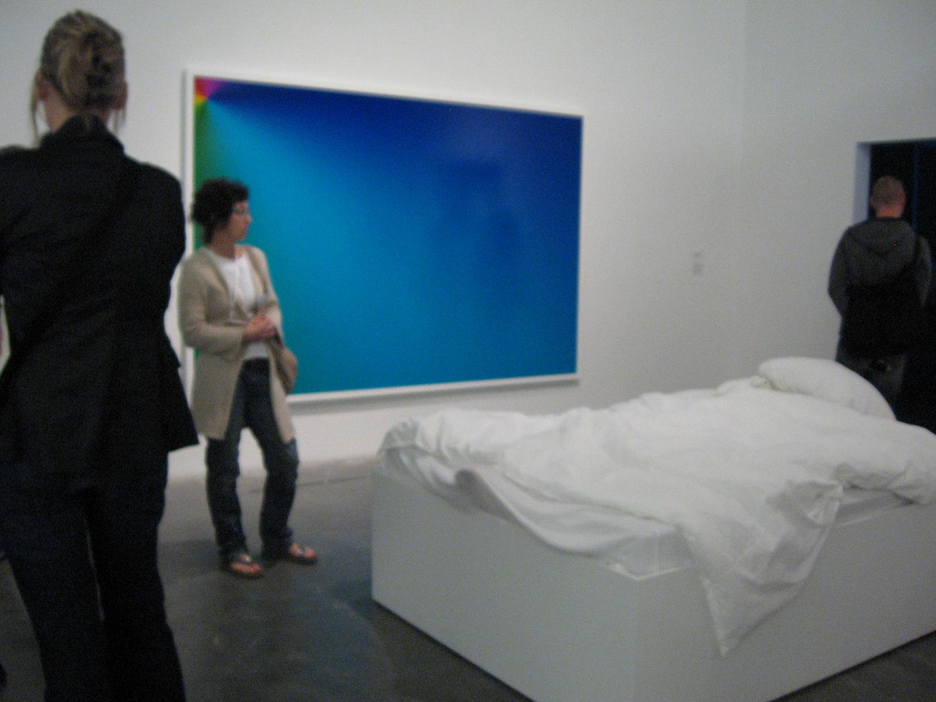 Some of the show, however, was a bit like cyberspace, with not much there there. (Of course, the Whitney Biennial often feels that way too. And surely this was no worse. It was even a bit more coherent). Take Cory Arcangel’s big blue screen of a print. It was so deep in its own emptiness that people were oblivious to it as they stared at a real, sleeping young woman on a bed in the gallery. The performer in Chu Yun’s This is XX was drugged with a sleeping pill–is this ethical? The reality of the vulnerable, sleeping woman overwhelmed the one-note gesture of cyber vacuousness, so I nearly backed right into Arcangel’s print.