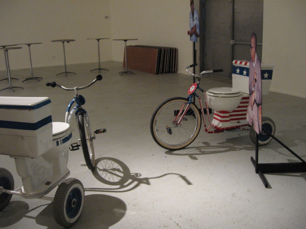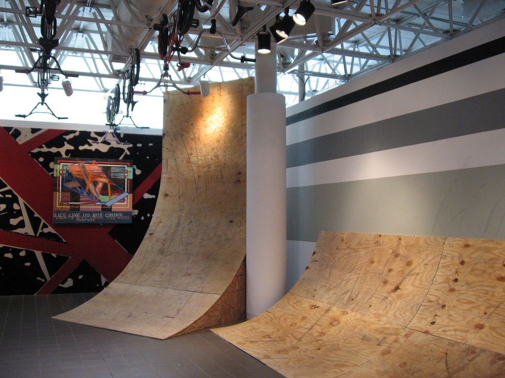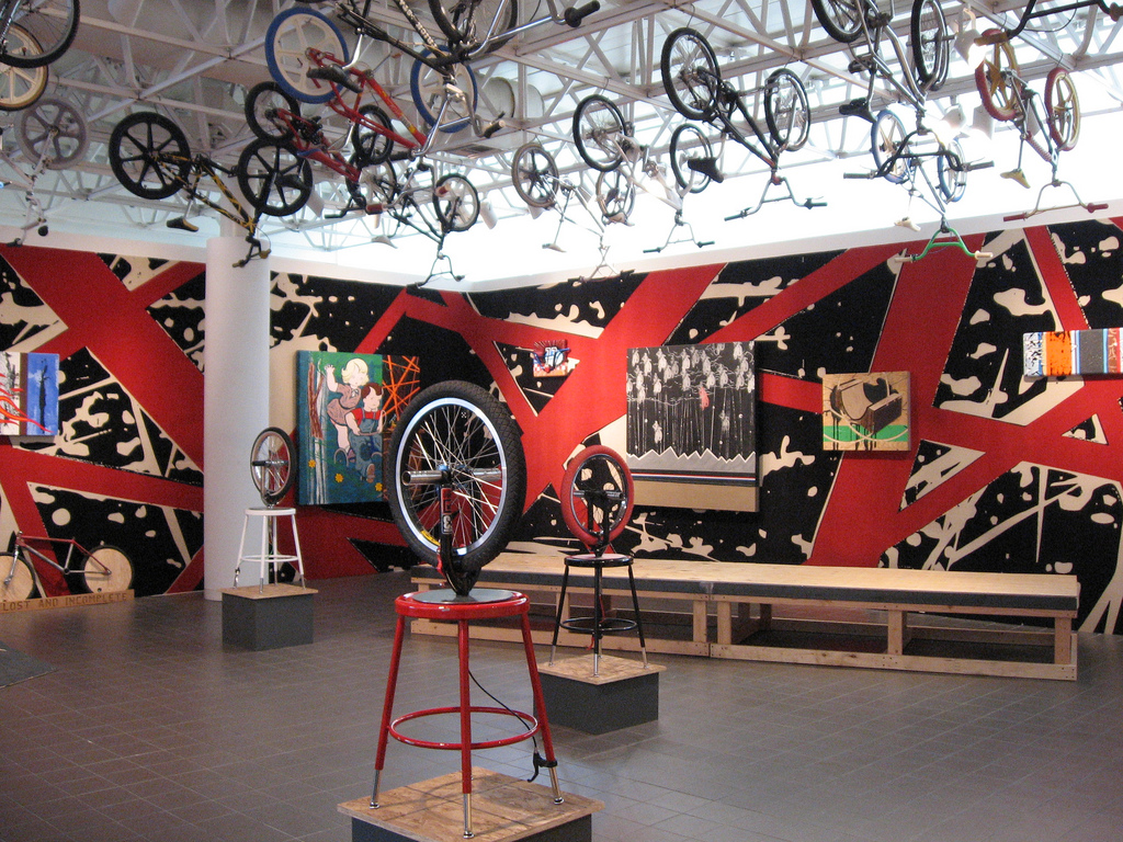 Artist and BMXer Ryan Humphrey has not only created a slick room installation of bicycles and bike-inspired works of art that bristles with energy and loads of bicycles, in the Levy Gallery. His exhibit Fast Forward, a recreation of this year’s Queens International installation, includes ramps of various configurations for BMX tricks. Bikes hang upside down from the ceiling. Marcel Duchamp-inspired bike wheels mounted on inverted stoolscan be flipped off their pedestals to serve as real unicycles (and they will be (see Silly bike tricks section below).