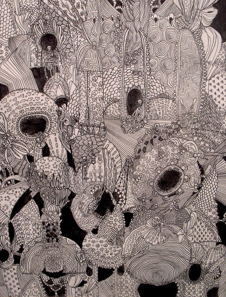 More than technique, more than composition, the humor of the drawings is what makes them worthwhile. The titles (It’s Like Anne Frank but with Less Attic, for example) and artist statement are amusing to say the least. Jones writes of her work that it is “translated through both a fragmented and self-aware lens, one that is reliant on normalcy and coherence and above all, one that avoids the distilled honesty demanded throughout the work.” Excuse me, what? The drawings themselves are highly comical. The cutesiness of the patterning serves to juxtapose the stark, confusing, and gloomy abstract shapes. The emotiveness of hundreds of small hearts makes the drawings at once faulty and vulnerable. We can’t help but laugh.
