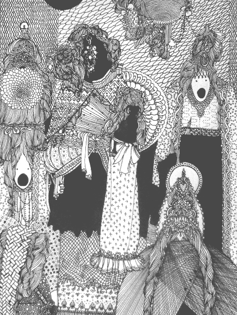 The show features a variety of Jones’s drawings, accompanied by small gouache portraits of figures like Yoko Ono, Janis Joplin, Minnie Mouse—in other words, the crazy ladies. The portraits act as gestural moments that inform the larger graphite drawings. Not unlike Rembrandt’s many crayon sketches before an oil painting, these portraits outline the complex sentiments of the other, more finished compositions. The graphite drawings are simultaneously visually satisfying and terrifying. Eerily cute patterns interact with ominous black shapes and empty space, providing glimpses of clarity within unrecognizable frames. Though fully abstracted, the drawings are not inaccessible. They serve as theatres of emotional performance in which our own maudlin culture and art history are the key players. A piece like Mom and Sister Give Inadequate Sex Talk, for example, reads as much hallucinogenic nightmare as it does a Mary Cassatt painting. Figurative representation is superseded by emotional truth; the saccharine detailing yields to a larger management of loss.