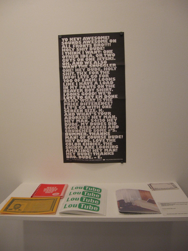 And on another note, the upstairs show is the annual printmaking competition, which looks more in tune with Wright than you might have imagines. Some highlights include Karisa Senavitis and Kevin O’Neill, aka Will Work for Good, for their group of low-production-value zines and posters, Clear Communications, which won a Silicon Gallery award!
