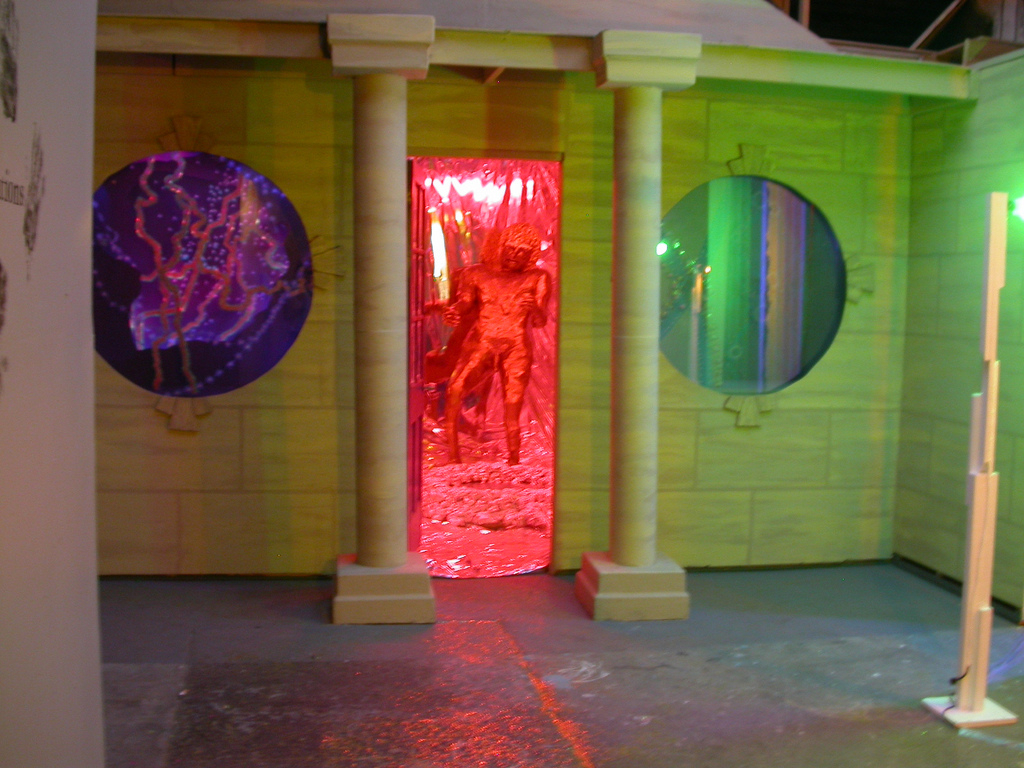 Katie Miller told me she had worked for a year on the figures in her mylar-swathed red room. They were truly formidable — a lifesize nude male and female — influenced, she said by the Critical Art Ensemble’s Cult of the New Eve. I asked her where she got all that mylar. Online, at mylarstore.com.