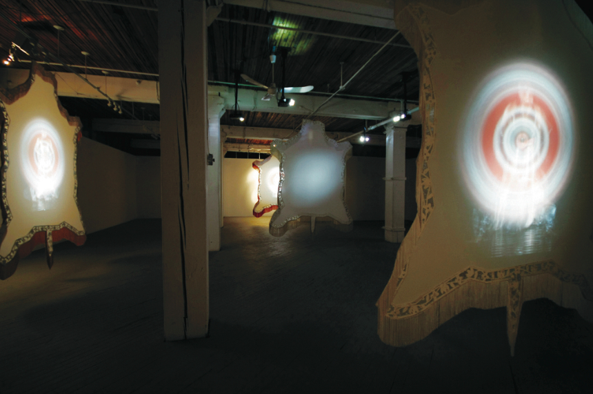 Kent Monkman’s video installation Dance to the Berdashe begins in darkness. Four projection screens decorated with tassels and shaped like bear hides surround a central screen. A gloved hand appears drawing simple icons of different natives on the surrounding screens. The larger-than-life drawings become animated dancers and then come to life by overlay of human figures, bringing the viewer into a live filmed ritual.