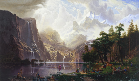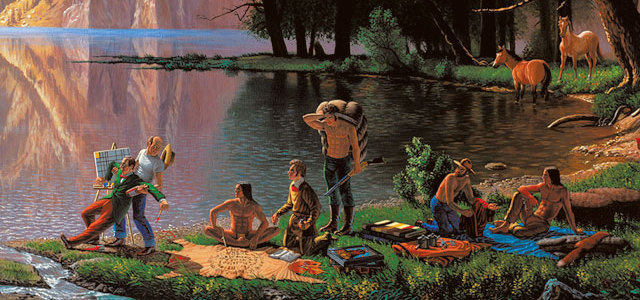 In a painting, on display in an adjacent room at the MMFA, Monkman has masterfully recreated Albert Bierstadt’s Among the Sierra Nevada, California (1868). Or so it seems. Upon closer inspection, the majestic scene is actually populated along its lower edge by buff half-naked settlers, well-coiffed gentlemen, casual natives, a cross-dressed man posed as a Botticellian Venus, as well as Westerners pretending to be Natives for a photographer. The work, entitled Trappers of Men (2006), wittily, humorously and masterfully pokes fun at history/colonialism/gender/sexuality/representation. A plaque below the painting attributes it not to Monkman but to his alter ego Miss Chief Eagle Testicle.