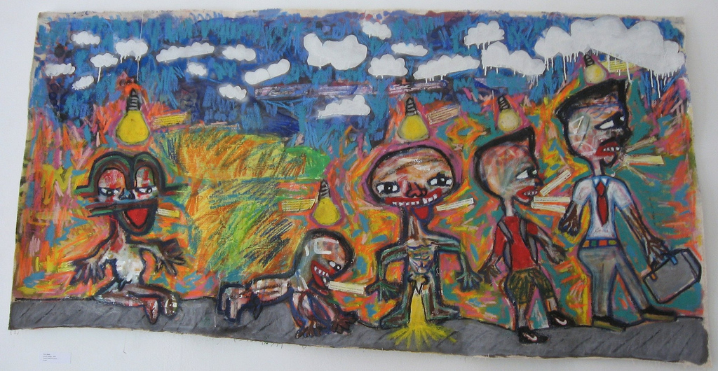 Eric Abaka, painting looks like our gang meets the Rapture. Note the guy on the left who looks like Donald Duck and the Horace Pippin clouds. Abaka was a Philadelphia artist who is now in Chicago.