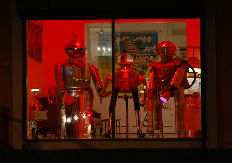 Vazquez’ normally displays his robots in a store-front window display at 5th and Allegheny. Vazquez’ storefront isn’t even a store. It’s just the place Vazquez displays his tin army for the pleasure of the neighborhood. Maddox happened by there, liked what he saw, and asked about letting the gallery exhibit the robots.