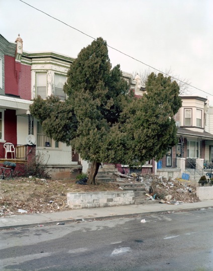 The Eden theme comes up in a couple of photos by Daniel Traub, but in Traub’s cause, Eden isn’t so much lost as aspired to. His Tree, North West Philadelphia 2008, is a scrappy survivor on a trash strewn rowhouse front lawn, nature’s toehold in an unwelcoming environment. Traub’s Two boys, North Philadelphia 2008, shows two slightly uncomfortable, vulnerable youths, one hiding behind his hoodie with his legs in a posturing wide stance, one with his hands clasped shyly in front and his legs close together, in front of a weedy array of growth. Their young good looks also suggest survival, as does the tree, and the weedy Eden behind them tells pretty much the same story. (Traub also has an exhibit up at the Art Institute of Philadelphia until Oct. 16).