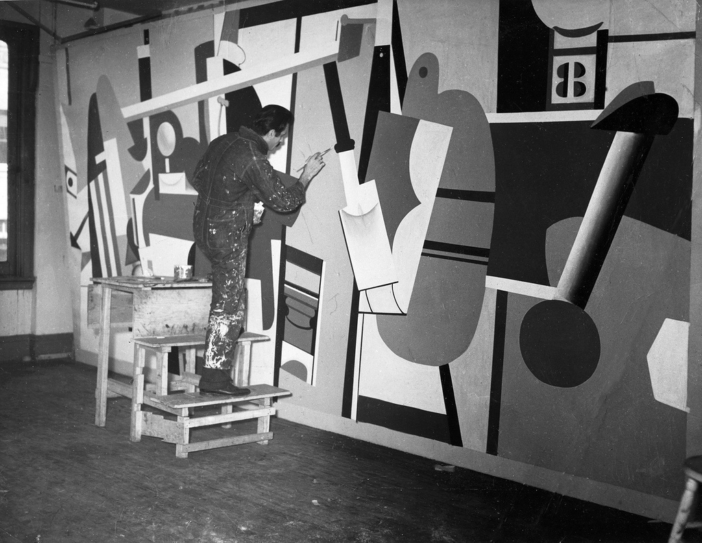 The enormous works on canvas are super-flat super-graphics of a sort, inspired by machinery and aviation and the plan of the airport, with the same belief in the power of technology that imbues Leger. The paintings (there were 10 in all but only two, both in the show, survive) have a can-do American optimism in their straight-ahead flatness and color.