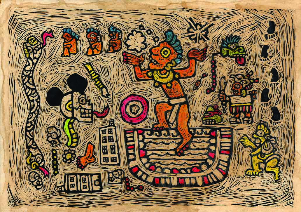 All the works are small — in the neighborhood of 12×15″ — and most are affordable. Edwin Vazquez’ “Egghead Codex (Page 6)” — which inserts Mickey Mouse into a pretend-Pre-Columbian hieroglyph — is a visionary mash-up that honors the artist’s ancestors while knocking upside the head one of today’s major corporate symbols.