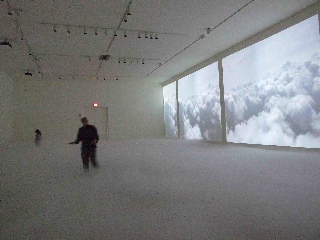 The site-specific video installation, 40,000 feet, by Netherlands artist Su Tomesen, projects floating clouds and ocean filmed from airplanes around the world. The installation also includes smoke (ah-choo) and light and sound. It’s a sort of landscape that is at once familiar and unfamiliar. Philadelphia artist Candy DePew, recently on a residency in the Netherlands, saw Tomesen’s work there–a similar piece designed for a very different space, a restaurant–and suggested the piece for ICE.