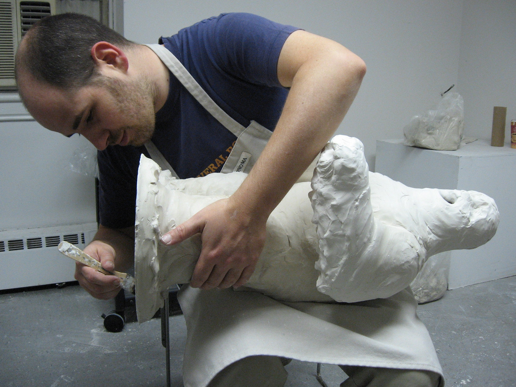 Brazilian artist Tiago Carneiro da Cunha is working in a small studio at University of the Arts, near the end of a fall-semester artist’s residency. He is creating a new version of Mudman, one of his stock characters the appear and reappear in his work. This version, a clay figure, is about 2 feet tall, about double a previous version, and too large to fit in the typical Brazilian kiln.