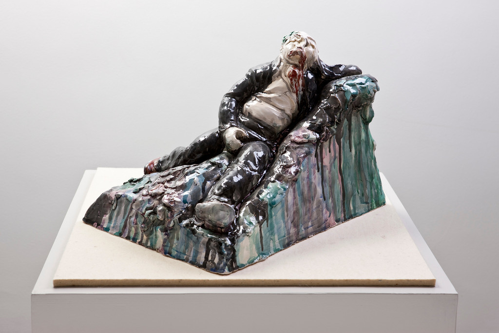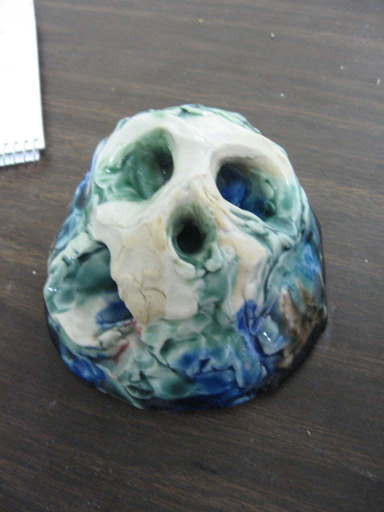 At 34, Tiago is full of charm, energy and enthusiasm. He apologizes for the small amount of work in the studio. Besides the figure, there are a couple of ultra-lumpy skull ashtrays with drippy glazes, part of a larger series with no two exactly alike. When I ask what they fetch at his gallery, he seems almost apologetic when he says $2,000. “They are either an expensive ashtray or a reasonably priced sculpture.”