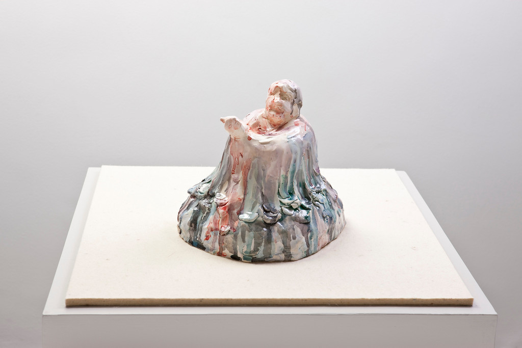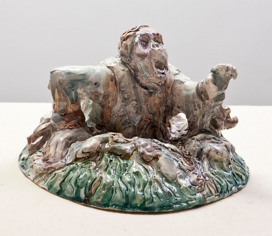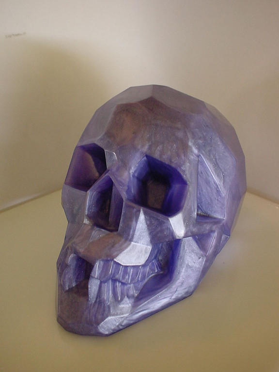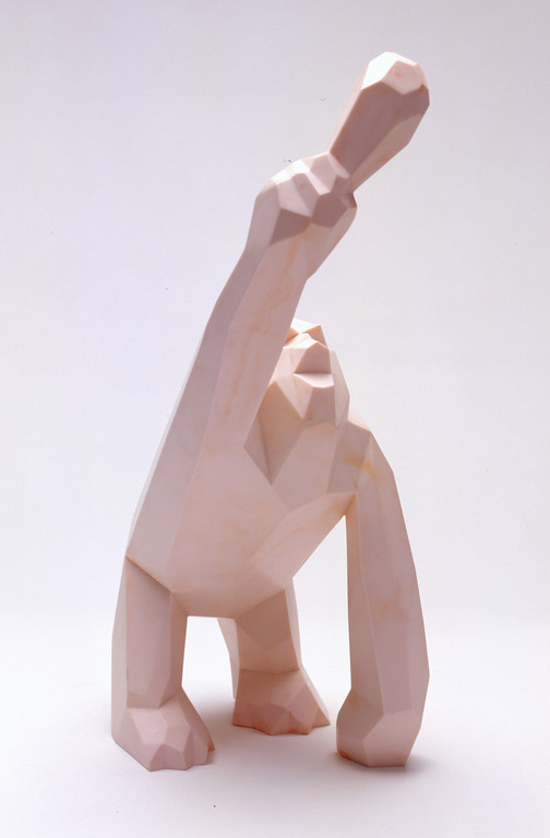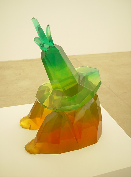His work has veered from slick, faceted objects cast in epoxy to chunky clay objects heavily imprinted with exaggerated thumb impressions and coated with drippy glazes. Tiago says the elegant facets on the epoxy pieces (which start as plaster) and the crude-looking fingerprints and the exaggerated lines in the clay work are all one–a preoccupation with gesture. “I think the subject matter is an excuse,” he said. “They are about preserving values more linked to drawing. …The facets and the thumb prints are the same thing, defining planes and spaces. I wanted to rescue drawing. I started drawing as a teenager. …With the resin I’m reducing the gesture to something shiny.” He switched to epoxy when he realized his folded paper sculptures were easily damaged.