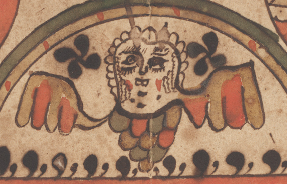 The Angel Bookplate (Bücherzeichen) for Anna Lädtermänn by David Kulp features that Egyptian-esque (wings of Isis) element of fraktur in the angel’s wings. The handwriting reads, “This little harmonious melody book belongs to Anna Lädtermännin, singing student in the Deep Run School. Written the 12th of January anno 1812.”
