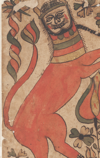 Another fantastic fraktur religious text is by Christian Beschler in 1799 which features an even more unusual-looking German medieval lion-cum-human opposite a unicorn. In between them is a set of wings with what looks like a hairy, bucktoothed angel smiling (?) delivering the message, “God, you are so rich today.”