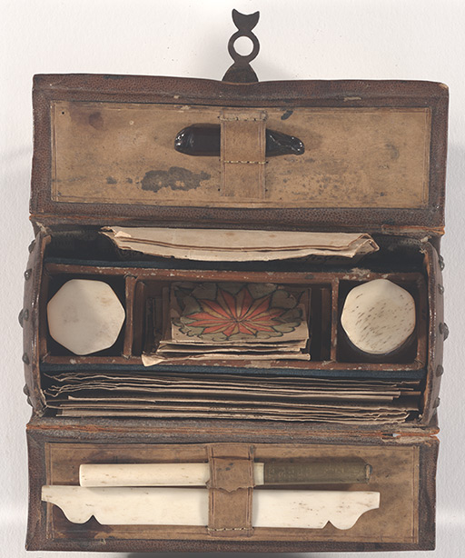 The exhibit also displays the box that the fraktur artist (the scrivener) used to hold tools. It is tiny (5 inches long) an contains a bone straightedge, ink powder, and pen nibs. Apparently in the 1700s printers began to sell more generic fraktur woodcuts that only required inscription and coloring-in. A very thick woodblock is on display next to the kit.