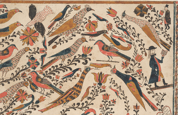 I loved the characters in Variety of Birds (anonymous artist, 1816). In the drawing, the dozens of splendid birds with startled expressions have taken over the world of two small, pious-looking men.