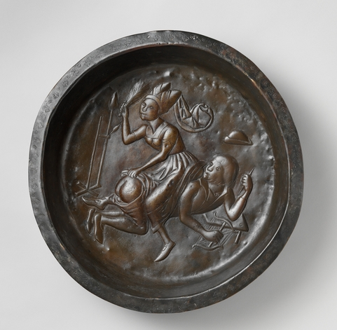 I would suggest seeing the Pennsylvania German gallery of sgraffito plates and furniture at the PMA as an addendum to the fraktur exhibit at the Free Library. The plates often feature similar humorous, profane inscriptions and imagery. These plates always reminded me of a brass plate I would see while walking through the medieval section of the Met. The plate is from the Netherlands, was made in the 1480s and is titled Wife Beating Husband.