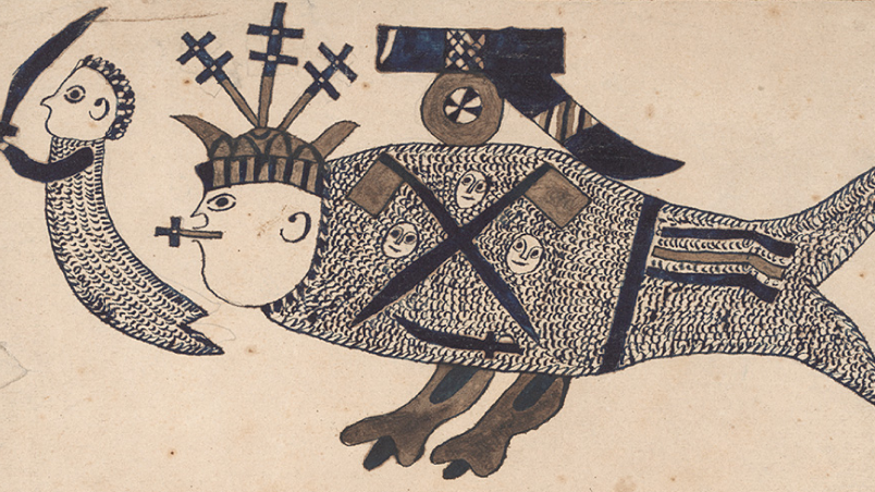The Wunderfisch reminds me of warfare-related drawings that my brothers made as children: as though one cannon were not enough to attack and threaten, to attack the Wunderfish (half crowned man, half fish, the feet of swans) you would first have to get past its sword-armed guard, then face the creature itself with a cannon on its back, three swords in its head, a sword in its mouth, and skulls mounted on its scaly body (previous kills). Incredibly dangerous.