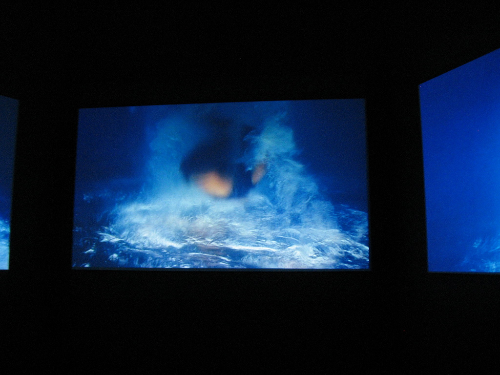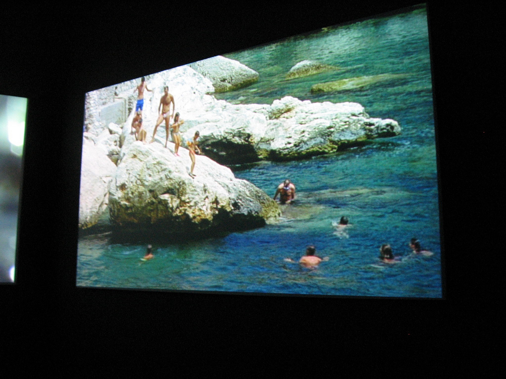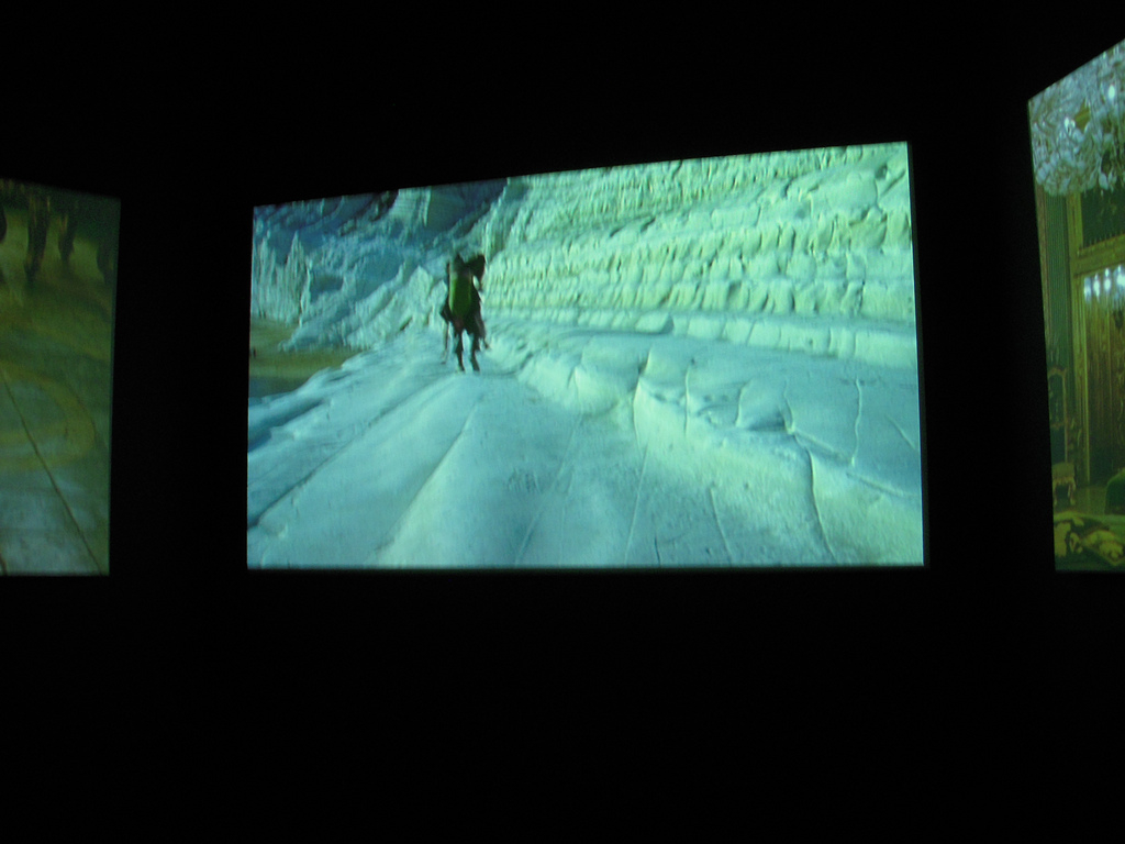 Isaac Julien’s 3-channel projection Western Union: Small Boats, 2007, is a poetical/political piece with watery realms of extreme sensuality and earthly realms both sensual and haunting. Julien works with dancers and here, he’s poised sinuous bodies in and around boats, sea cliffs and a baroque colonial mansion in North Africa. Without the use of a clear narrative thread you are immersed in a realm of suggestion.