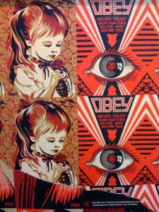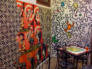 “He was a little drunk, but very nice,” says the barman. The Boteri, also known as Al Genovesi (San Polo 1701 Venezia) on the Calle Del Botteri, is a tiny little art hangout covered with Keith Haring inspired drawings. Fairey must have thought the café was ripe for some more American graffiti and so he returned the next day with a fat portfolio of his Obey propaganda and asked the owner if he could paper the back room with his designs. “No problem,” said the owner, eager to have some live art to go with the Haring installation and create a wall-sized souvenir from a clandestine Venice Biennale