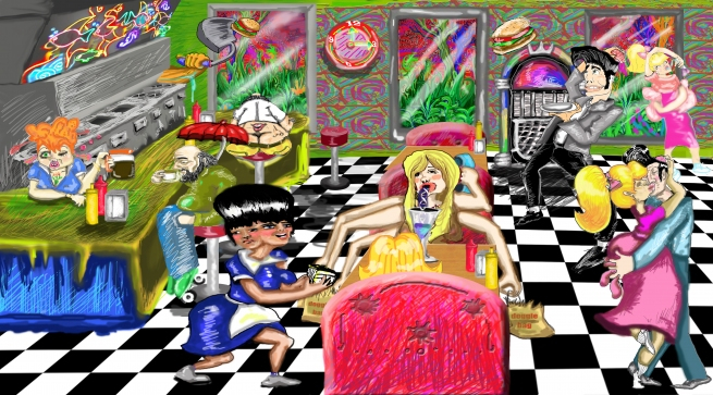 “Slo Mo” at Germ Books and Gallery is a valedictory exhibit celebrating three now-defunct artist collectives— Pifas , Bobo’s on 9th and the Philadelphia Athenaeum . The group show, curated by Pifas member April Glaser , has colorful and psychedelic works by artists affiliated with the three spaces. It will hardly be a sob-fest. Paintings, sculptures and video by artists Lindsay Kovnat , W.J. Hyatt , Brian McKelligott , Bobos and others will make the show as jolly and noisy as a New Orleans Second Line parade.