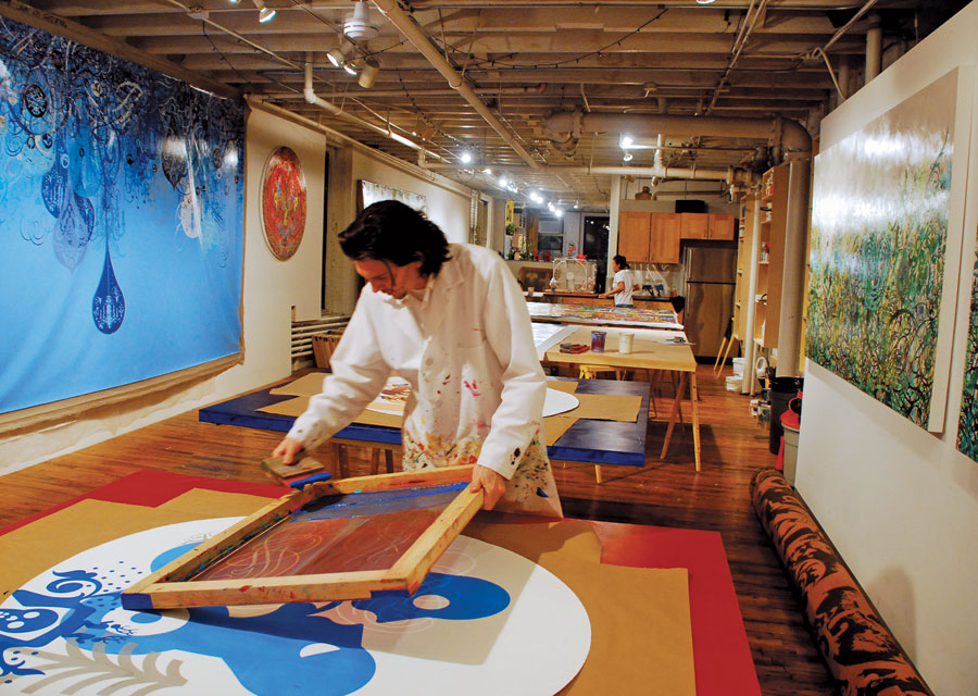 It’s a wonderful book for artists and for anyone who’s a voyeur of other people’s work spaces. For art historians, collectors or other art lovers it has the same appeal as paintings that show studio spaces: it brings us closer to the artists and hints at their working habits. Some studios resemble industrial spaces while others have a domestic feel. One artist lines up paint tubes like toy soldiers and another assembles chaotic arrays. We get to see the photos, post cards and ephemera that artists tack to their bulletin boards. It’s a secondhand intimacy, but seductive nonetheless.
