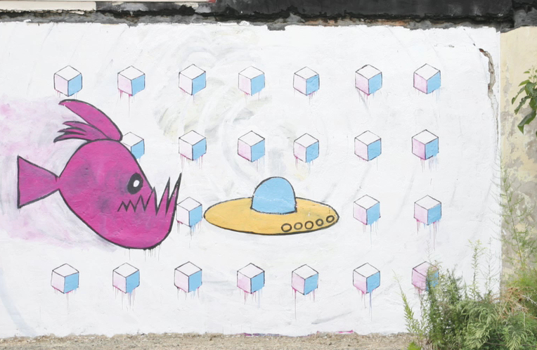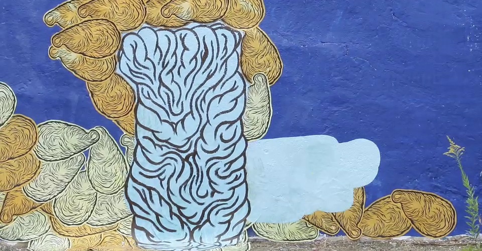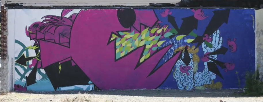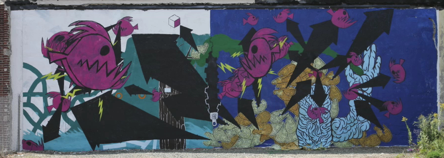 The mural (which I missed, I’m afraid) was painted by Eve Biddle, Joshua Frankel, Bonnie Brenda Scott and Mauro Zamora, and rather than collaborate on developing and executing one design the artists painted over one another’s work so the mural evolved over the two weeks of the festival.